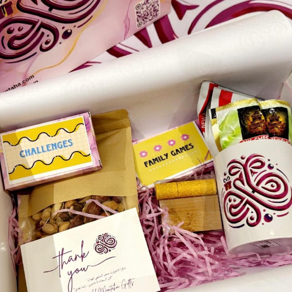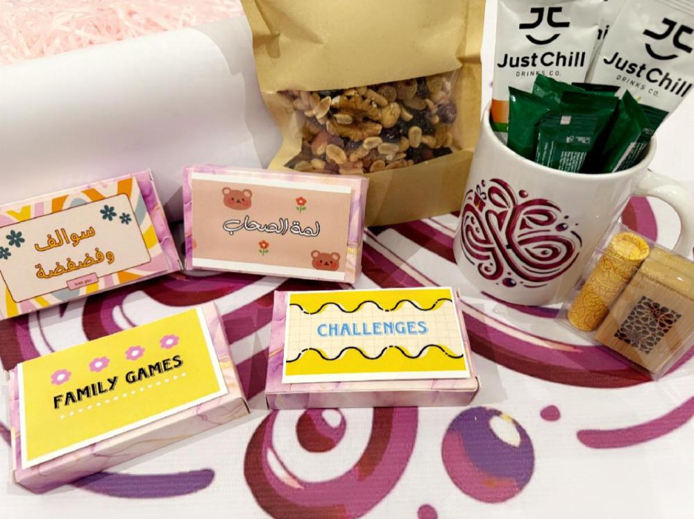 كوب بورسلين , قهوة مع ماتشا أو كرك , مكسرات , عدد 2 لعبة جماعية حسب الإختيار , أعواد بخور ذكي